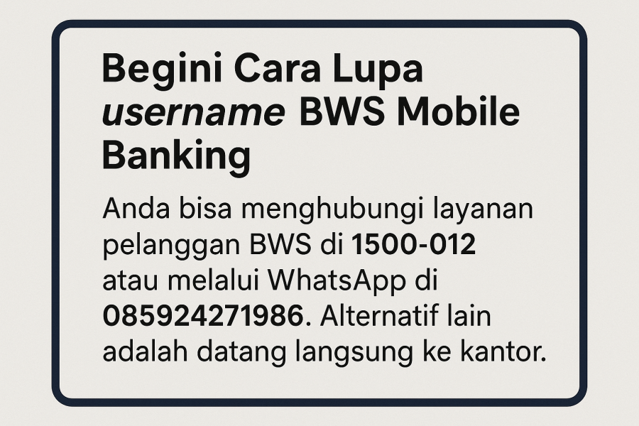 Cara untuk buka blokir BWS Mobile (Bank Woori Saudara) hubungi BWS melalui WhatsApp di nomor+62859_24271986. siapkan data diri seperti kartu BWS dan nomor rekening untuk verifikasi, atau kunjungi Kantor Cabang BWS terdekat dengan membawa kartu ATM BWS, buku tabungan, dan e-KTP.