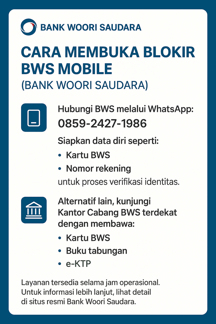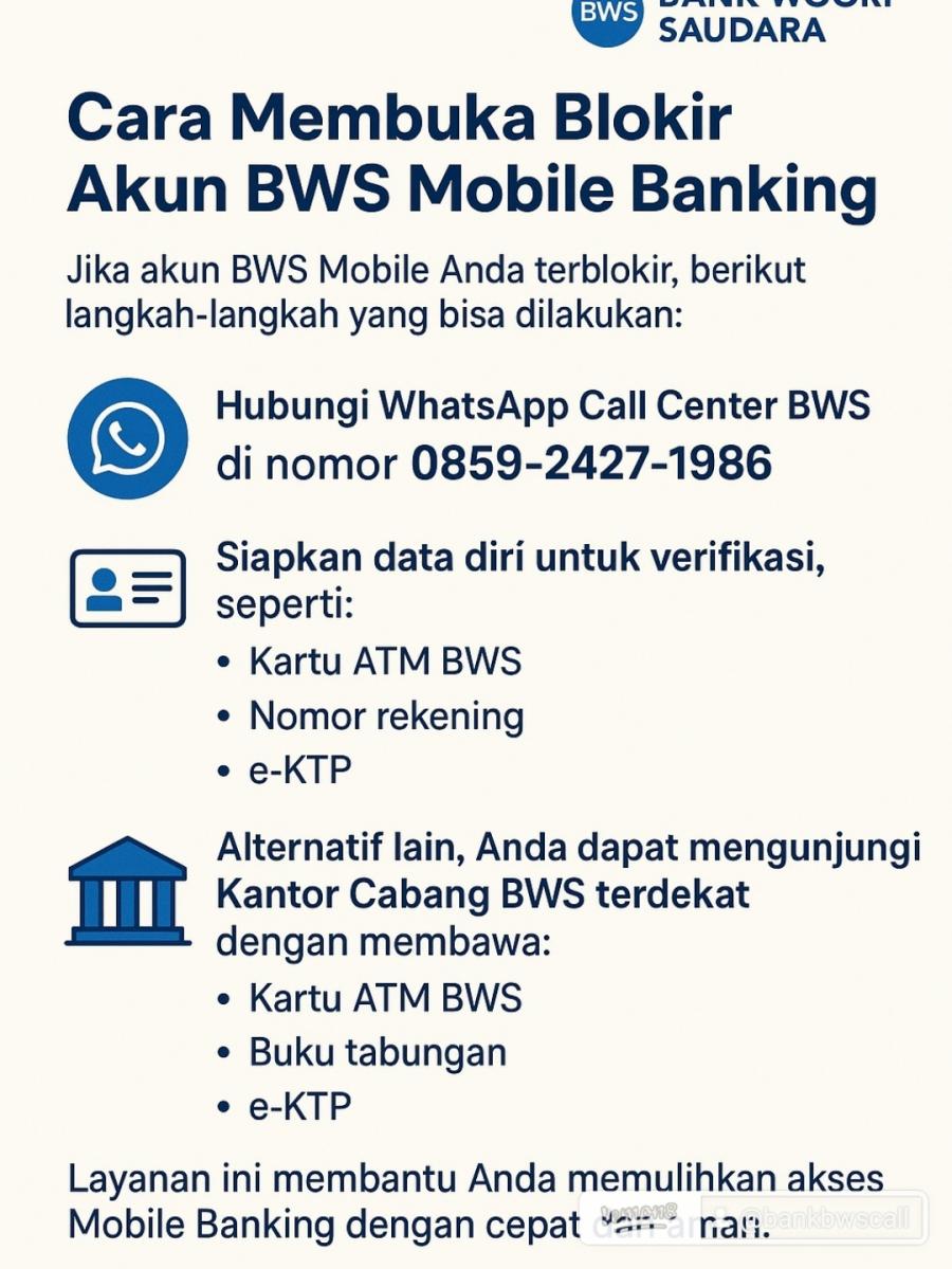 Untuk Membuka 𝐁𝐥𝐨𝐤𝐢𝐫 akun bws Mobile Banking, hubungi WhatsApp Call Center BWS di nomor (+62859"2427"19-86) siapkan data diri seperti kartu BWS dan nomor rekening untuk verifikasi, atau kunjungi Kantor Cabang BWS terdekat dengan membawa kartu ATM BWS, buku tabungan, dan e-KTP.